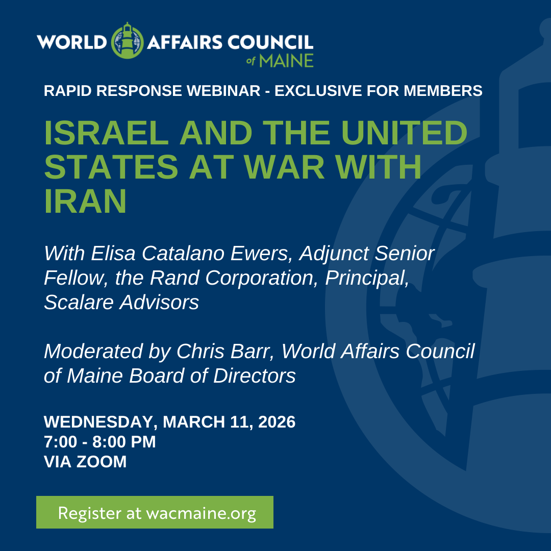 Is your organization holding an internationally focused event in Maine? The World Affairs Council of Maine is eager to promote global goings on around the state. If you would like to include your event on our calendar please submit your request HERE. We will need two to three days to review and approve community submission.